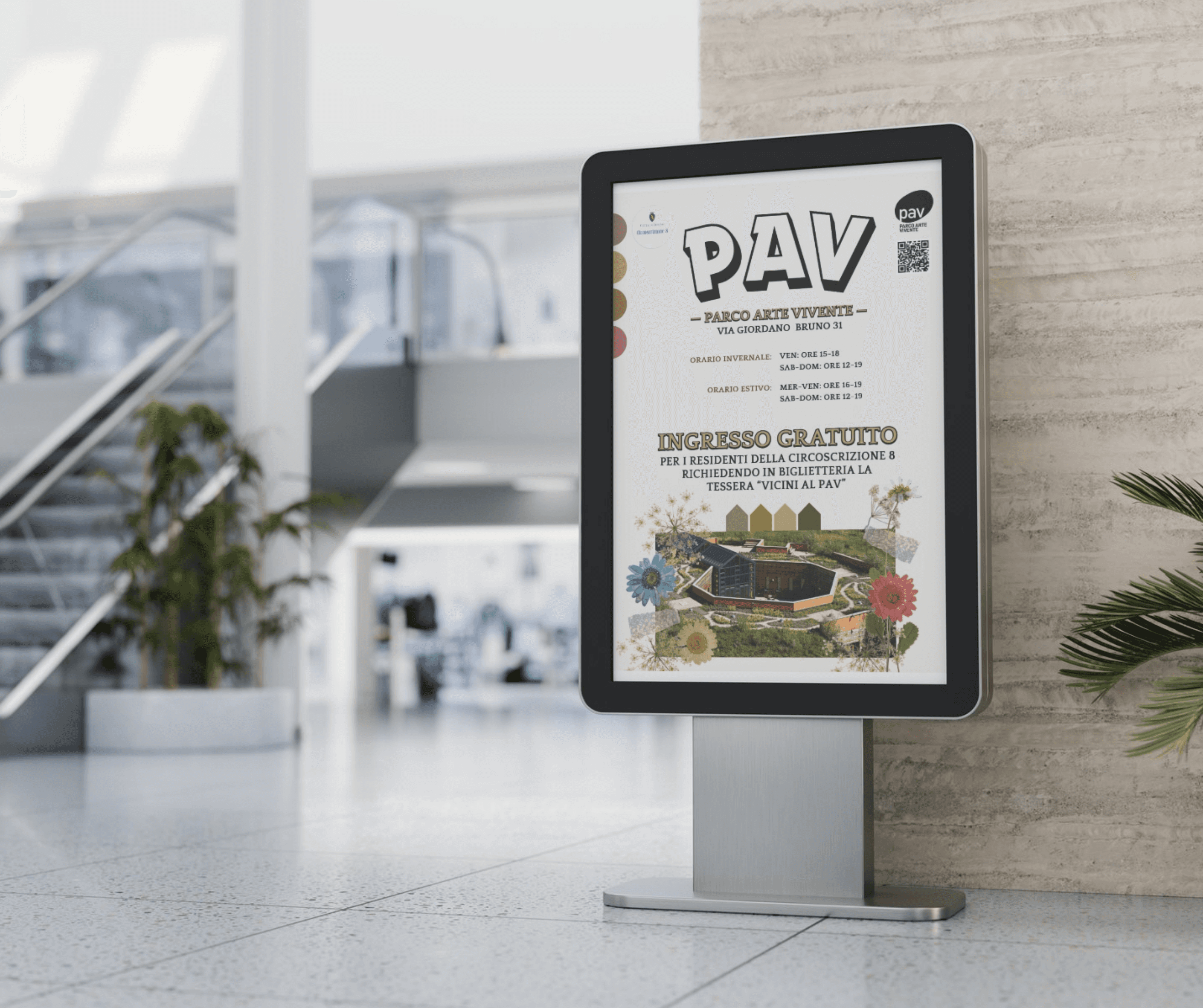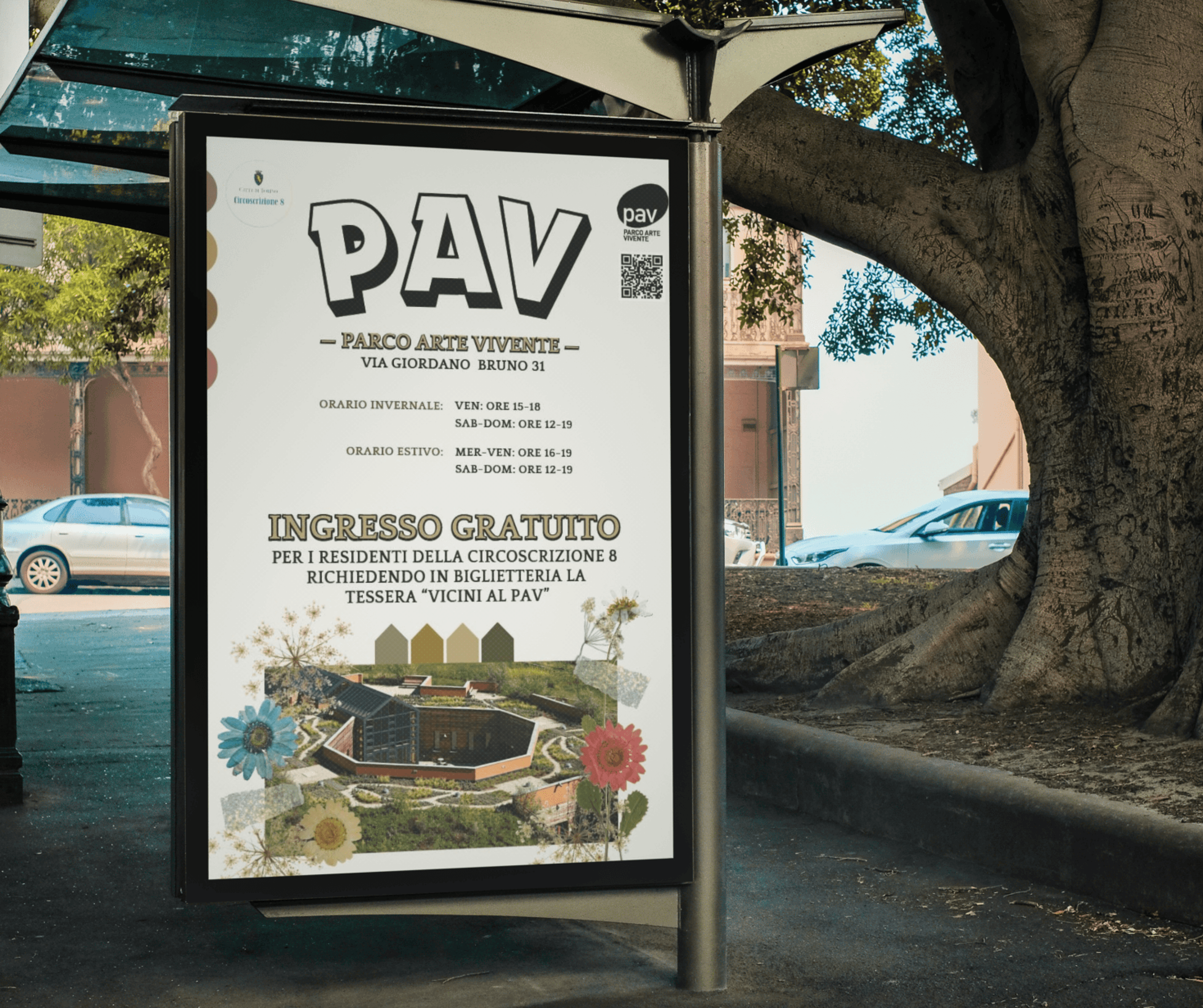 Per il progetto realizzato per la Circoscrizione 8 di Torino, ho curato la progettazione grafica del manifesto dedicato al PAV – Parco Arte Vivente, con l’obiettivo di valorizzare un’importante realtà culturale del territorio e rafforzarne la visibilità a livello locale. Il manifesto è stato pensato per una diffusione capillare negli spazi pubblici della circoscrizione: un supporto chiaro, riconoscibile e coerente con l’identità del PAV, capace di catturare l’attenzione anche in contesti urbani dinamici come fermate della metropolitana e aree ad alta frequentazione.